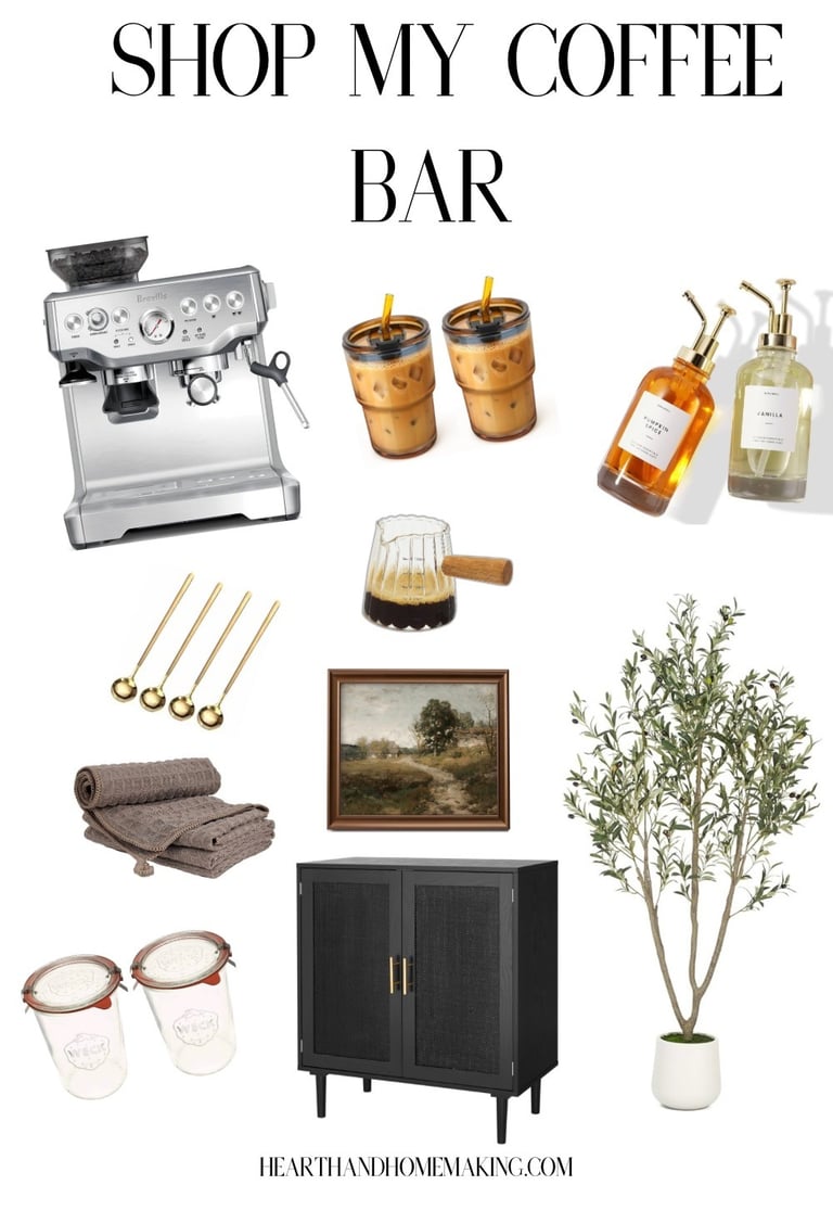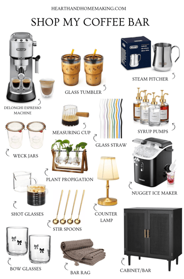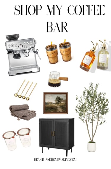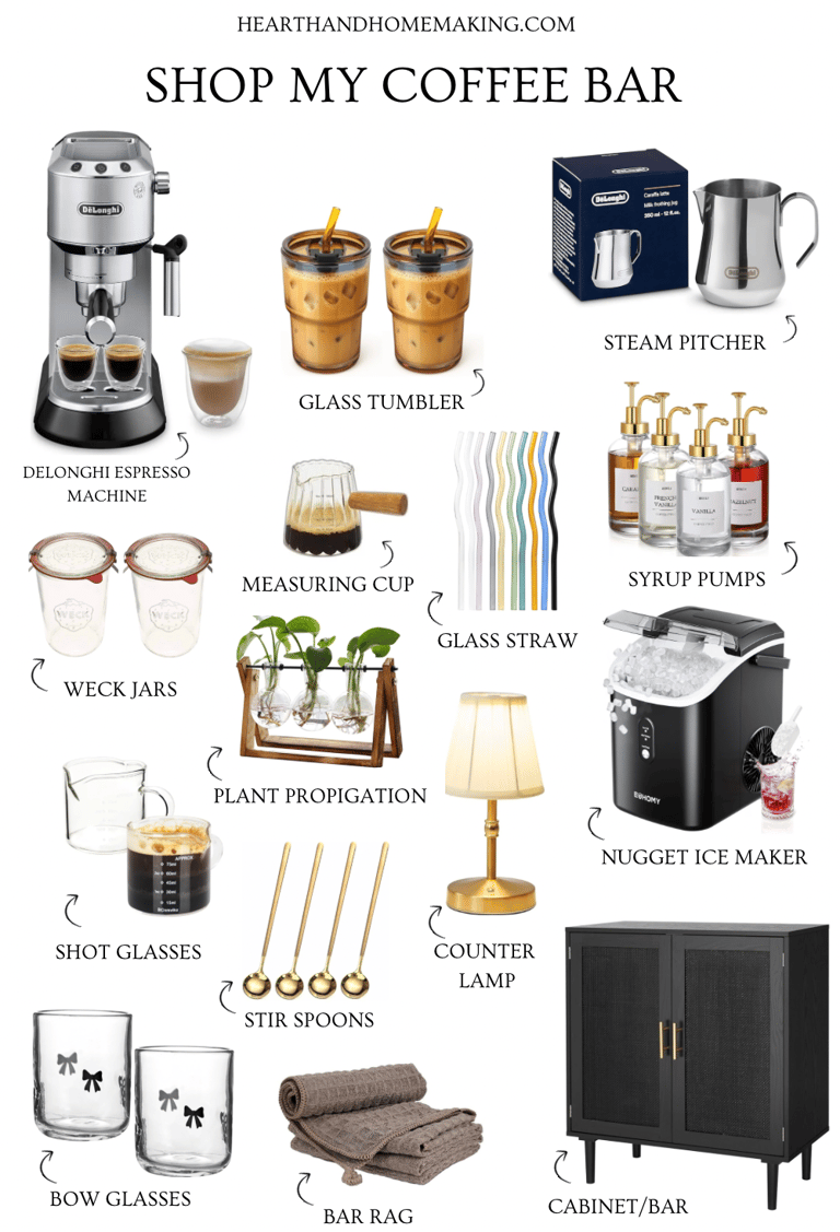 I’ve rounded up the exact tools and ingredients that make my home coffee bar possible. These are truly my non-negotiables, and I think every homemaker deserves a cozy little coffee setup of her own. You can find them all here: My Espresso Machine, My Favorite Iced Drink Cups, Milk Frother, Nugget Ice Maker, Bar Spoons, To-Go Glass Tumblers.